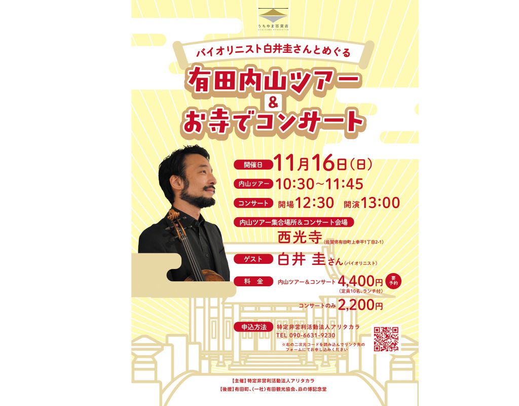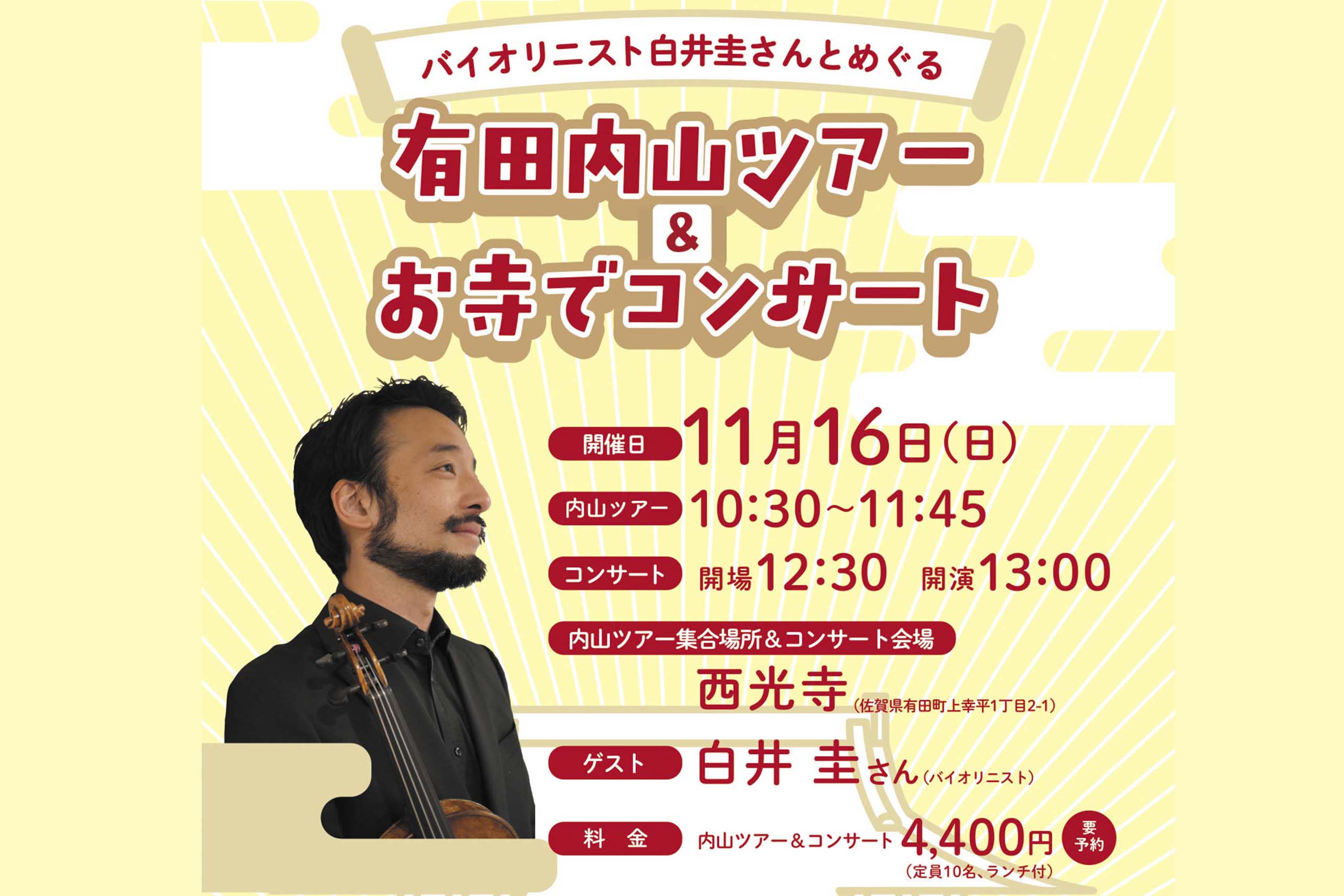 【要予約】「バイオリニスト白井圭さんとめぐる有田内山ツアー&お寺でコンサート」を開催します