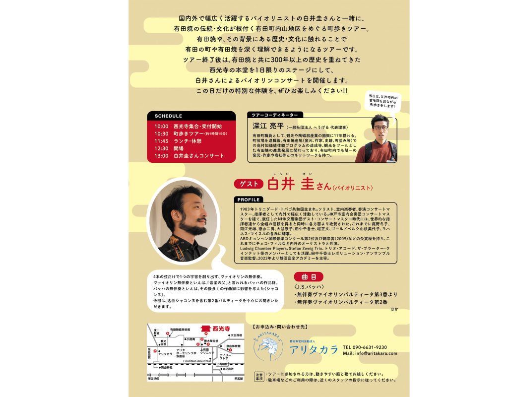 国内外で幅広く活躍するバイオリニスト・白井圭さんとともに、有田焼の伝統と文化が息づく「内山地区」を歩く特別な一日を開催します。
